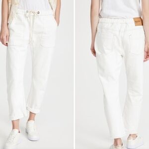 A low waist slouchy fit with an elasticated drawcord waistband. Added gusset detail at the crotch point, large cargo patch pockets on the front. Pearl white color. 100% Cotton. In great pre-owned condition!