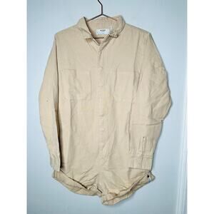 ONE TEASPOON Stone Khaki Canvas Prophecy Button-Up Jumpsuit in size Medium is the perfect blend of utilitarian style and everyday ease. Crafted from durable canvas in a versatile stone khaki shade, this jumpsuit features a relaxed fit with a tapered leg, ideal for a chic yet laid-back look. The button-up front, collared neckline, and short sleeves give it a classic touch, while an adjustable drawstring waist enhances the silhouette. Functional details include multiple pockets for added practicality.