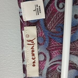 This ONE WORLD tunic showcases a striking graphic design in red and blue, with a relaxed fit and 3/4 sleeves. The decorative V-neckline adds a touch of elegance, while the soft, stretchy fabric ensures comfort for everyday wear. Its artistic pattern makes it a standout piece for any occasion.