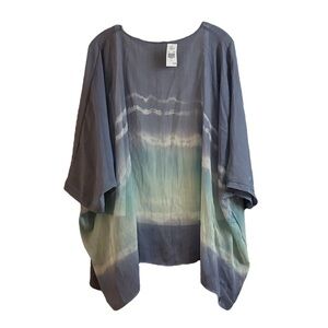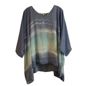 This relaxed and oversized tunic from ONE WORLD features a beautiful gradient design transitioning from gray to blue. The tunic's boxy silhouette and wide, draped sleeves offer a comfortable and stylish fit. Crafted from a lightweight fabric, it exudes a casual and bohemian vibe, perfect for any laid-back occasion.