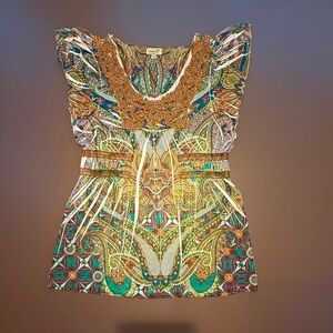 This elegant blouse from ONE WORLD features a captivating blend of green and brown hues, enhanced by ruffled and embellished details. The cap sleeves add a touch of sophistication, making it a versatile piece for any occasion. Its intricate design and flattering silhouette make it a standout addition to your wardrobe.