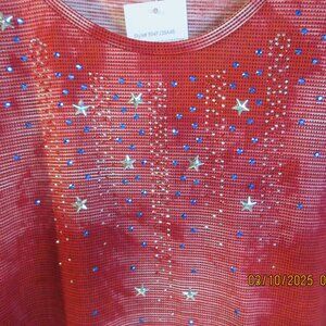 Dress up in this One World top, brand new with tags, and showcase a striking red, white, and blue color scheme that's sure to turn heads. The lace detailing adds a touch of elegance, making it a perfect choice for any casual or semi-formal event. With a comfortable round neck and cap sleeves, this medium-sized top embodies a blend of style and comfort tailored for the modern woman. Crafted from a mix of polyester and spandex, the fabric offers a stretchy fit that moves with you, ensuring you look polished without sacrificing comfort. Whether paired with jeans for a daytime look or dressed up with a skirt for an evening out, this adorable piece is a versatile addition to any wardrobe. It has 7 1/2" side slits perfect for comfort!!!