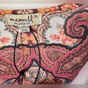 This ONE WORLD blouse showcases a vibrant pink and red color palette with a striking graphic design. The 3/4 sleeves and artistic patterns create a bold and dramatic look, perfect for making a statement. Crafted with a comfortable fit, this top is ideal for adding a touch of flair to your wardrobe . Y2k Size 1X Hippie Boho and Rhinestone 96% polyester, 4% spandex