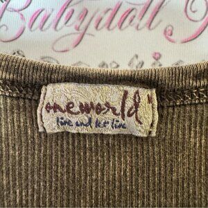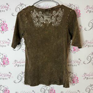 ONE WORLD top distressed sleeve graphic art button rhinestone embellishments