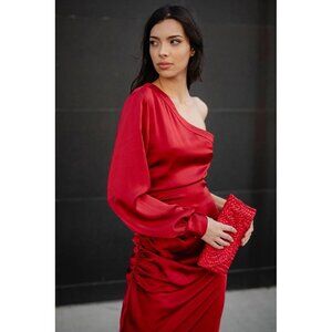 ONE33 Social’s The Elana is a stunning ruby red one-shoulder midi cocktail dress featuring a sleek sheath silhouette. It’s designed with ruching along the right side seam, side seam buttons on the left, and a chic leg slit. Made from stretch satin crepe, it includes a side zip with hook-and-eye closure. Size 00 US, retailing for $440, brand new with tags.