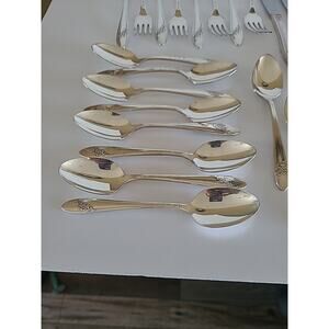 Set includes: 8 forks, 8 knives, 10 teaspoons, 3 small serving spoons, 1 tablespoon, a butter knife, meat fork, 1 large serving spoon and 1 ladle.