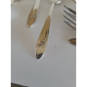 This popular pattern was introduced in 1946 by Oneida Community with their "Tudor Plate" trademark. This pattern was offered as a Betty Crocker premium by collecting coupons from boxes of selected General Mills products. An expert from one of their many ads states: Lovely Queen Bess Pattern. Extra heavy silverplate; principal forks and spoons reinforced with additional layer of pure silver. Dramatic new Queen Bess design inspired by the Garden Rose of China.
