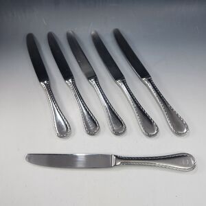 Set of 6 dinner knives by Oneida in their Belmont Lyons pattern. Made 2003 - 06, retired. Good used condition.