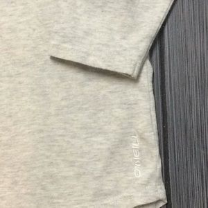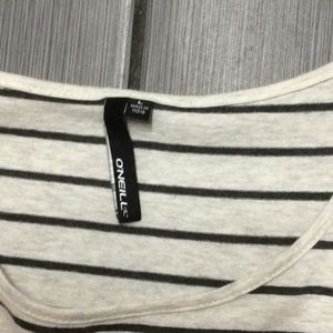 ONEILL...WOMENS BLUE AND HEATHER GRAY STRIPED THREE QUARTER SLEEVE SHIRT...SIZE:L...WORN SEVERAL TIMES...NO RIPS/NO STAINS