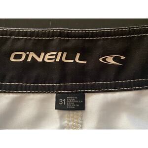 O'NEILL Blue/Gray/White Stripe 21" Boardshorts size 31. Featuring a cargo pocket w/velcro flap closure, logo patches, quick dry, neoprene fly and a velcro/drawstring closure.