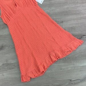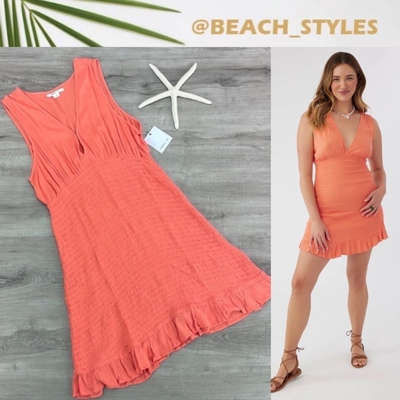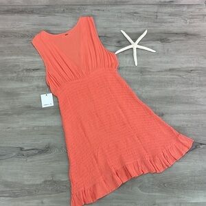 Woven mini dress that features a v-neckline, fully smocked skirt and solid color wash