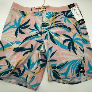 Elevate your swimwear game with these O'Neill board shorts in a playful pink and blue palm tree print. Made for men in a regular fit, these above-the-knee shorts feature a 20" inseam and hyperfreak technology for ultimate comfort and flexibility. Perfect for a day at the beach or lounging by the pool, these board shorts are sure to turn heads.