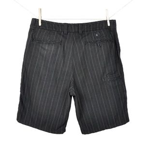 This is a very nice pair of O'Neill shorts. Pinstripe with suit-like detailing on front, back pocket and waist trim. 3 back pockets, two main (one with loop, button, logo) plus one small pocket. Soft black (or dark charcoal gray). Button/zip fly. Soft not stiff. In excellent condition.