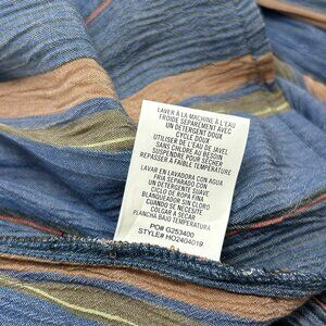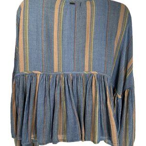 O’NEILL Rosie Top Sz L Navy Blue Striped Front Tie Balloon Sleeve Ruffle Viscose