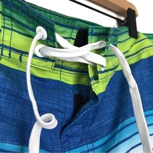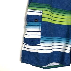 O'NEILL Surf Striped Board Swim Trunks Shorts. Velcro and tie closure. Side pocket. Striped colorway. Side logo detail. 100% Polyester. Machine wash.