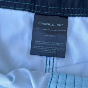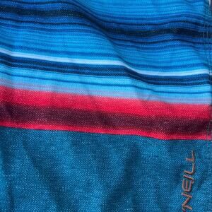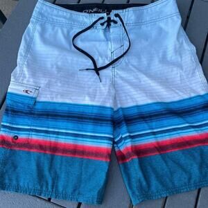 O’NEILL board shorts, men’s size 33. White stripes to shades of blue, red, maroon back to blue.