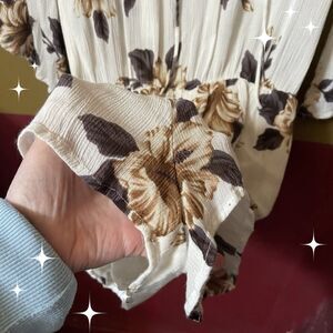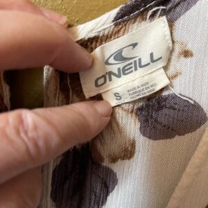 ONEILL size S jumpsuit (shorts) crepe floral lace up front key hole back.long loose sleeves. Crinkle stretchy fabric. Lined on bottom. Lining is 100% cotton and exterior is 100% Viscose. Elastic waist . Pit to pit 20” and length 30”.