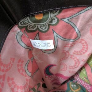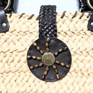 Adorable straw bag with brown leather accents and fun printed lining. Multi-pocket inside.