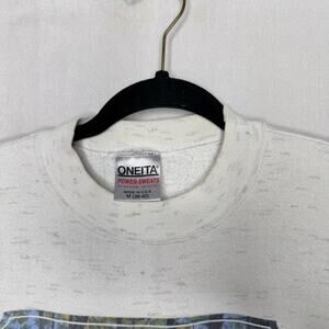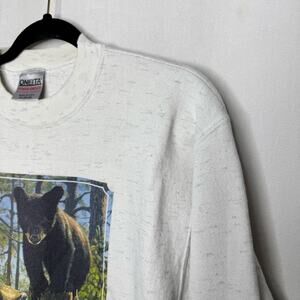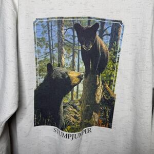 Oneita vintage space gray white “stump jumper” cute bear forest woodland screen printed graphic crewneck sweatshirt women’s size medium