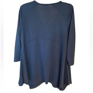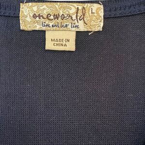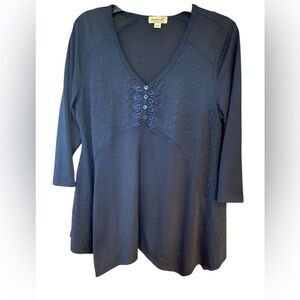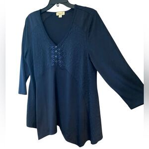 ONE WORLD Sz L Navy Blue Boho Embroidered V-Neck 3/4 Sleeve Fit & Flare Top