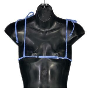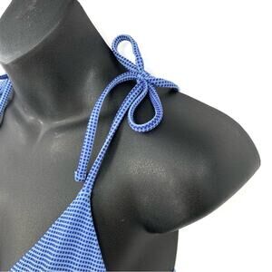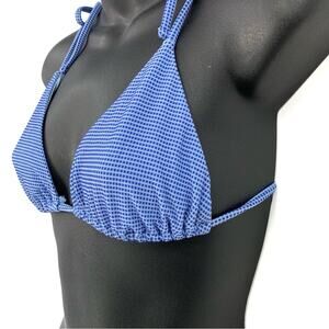 Onia Alexa Bikini Top in a dark blue and light blue checker pattern. No size, but fits as a small. Tie closure at the shoulders, adjustable on the back strap. Not padded, two layers of fabric. Shoes some wear, has lots of life left.