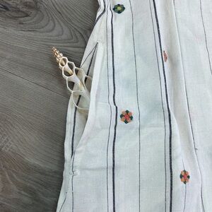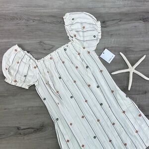 So sweet knit mini dress that has a yarn dye stripe design, flowy fit and unique embroidery detail.
