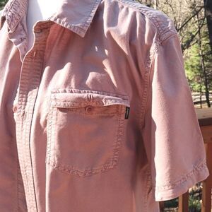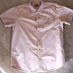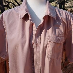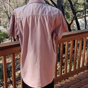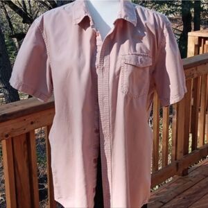 This short sleeve shirt is 100 % cotton. Standard fit. Front tab pocket. Button down front. Slightly curved bottom. Size L measures 48 at chest. 31 long. A great shirt.