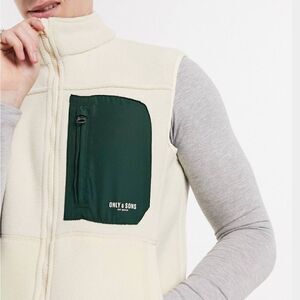 Only & Sons cream and green fleece zip-up jacket vest for men. Soft fleece material with a stylish two-tone design, full zip front, and stand collar. Great for layering in cooler weather. New with tags, size medium.