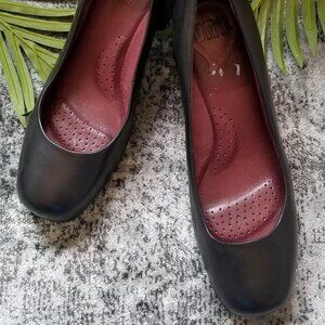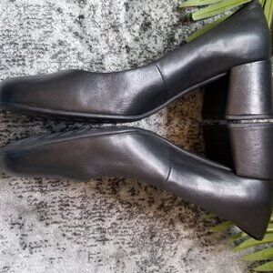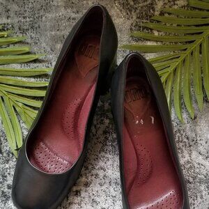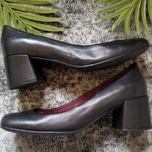 Comfy and beautiful smooth black calf leather. Clean, simple styling—so versatile. Rounded toe, cushioned insole. Grippy, textured rubbery outsole. Flared, chunky 2” heel.