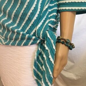 I love the lines on this top. It’s figure flattering. Teal and white striped V necked top that ties on your left side. See the ties laid out in picture 11. Imported. Beautiful stitching with 3/4 sleeves. 50% Cotton 47% Polyester 3% Spandex. Machine wash in cold water. Tumble dry low.