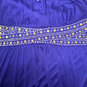 This stunning Onyx Nite maxi dress is the perfect choice for any formal occasion or party. The dress features beautiful blue embellishments and a zippered back. The sleeveless design and A-line style add a touch of elegance to the dress while the wrinkle-resistant and lined features ensure comfort and ease of wear.