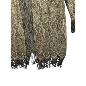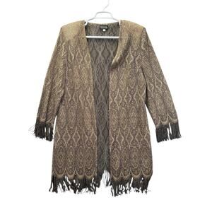 The ONYX NITE by WENDYE CHAITIN Open CARDIGAN in size 18 is a stylish and elegant jacket perfect for various occasions. Made from sheer acetate with a gold shimmer, this mid-length jacket features a lightweight and breathable design with fringe accents. The open closure and long sleeves make it suitable for travel, parties, formal events, and casual wear. Hand wash only and made in the United States, this jacket adds a touch of glam to your wardrobe with its geometric pattern and metallic theme. A must-have piece for the summer, fall, and spring seasons. Please check Pictures for details and measurements