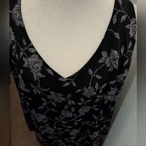 very good condition, front & back sleeveless v-neck, silver glitter in a floral pattern, on top, black on the bottom with a 21" side slit, made in the USA, 90% polyester 10% spandex, pit to pit 24" length 56.5"