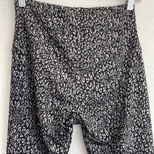 Sleek and comfy Onzie patterned leggings. The pattern is a pretty taupe colored speckled design on a black background. Size M/L. In excellent pre-owned condition, no visible flaws.