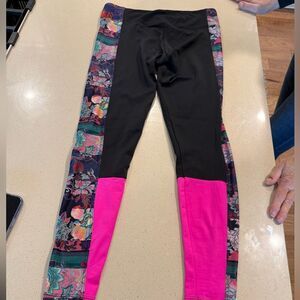 Vibrant leggings featuring a playful mix of black, pink, and multicolor patterns. Perfect for adding a pop of color to any outfit.
