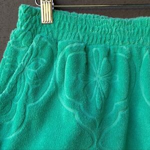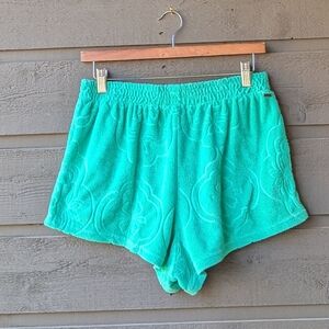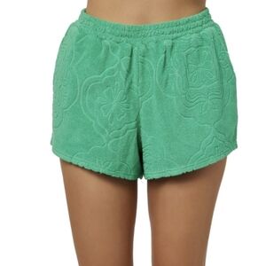 Excellent preowned condition O’Neil Cabana Tile Pattern Terry Cloth Cotton Blend Shorts in Gumdrop Green. Color best shown in closeup pictures. Elastic waistband. Pockets on front. Super cute textured flower tile design. 83% cotton 17% polyester. Machine washable. Clean. No flaws.