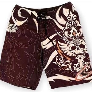 O’Neill 32 Skull Boardshorts, Brown / White , Gothic Skull, Logo Day Of The Dead. Preowned. Some overall wear. A couple of tiny, light stains - they are not very noticeable. Waist measures approx 32”. These board shorts really stand out at the beach or pool, with the skull graphics!