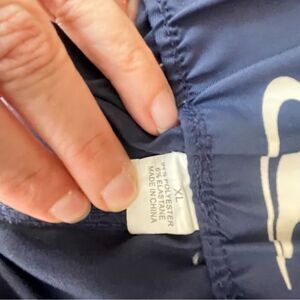 These blue athletic shorts feature a distinctive patterned waistband. Made from a comfortable athletic material, they offer a relaxed fit. The shorter inseam ensures ease of movement, making them ideal for sports and casual wear. Hip slung, beach, surfer, Y2K style. Excellent condition.