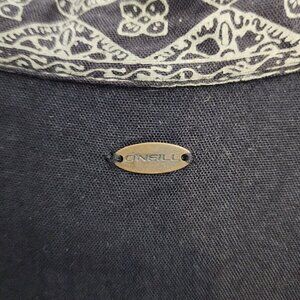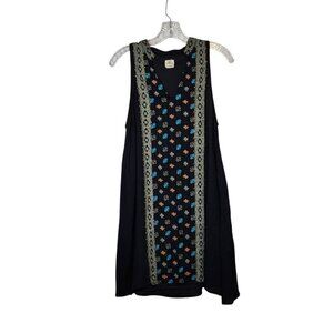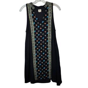 Pre-owned O'Neill sleeveless black dress in size Large. Features a boho-inspired design with multicolor embroidery in blue, orange, and white, accented with brass-tone beads and discs along the front. V-neckline with split stand collar, fully lined with soft cotton for comfort.