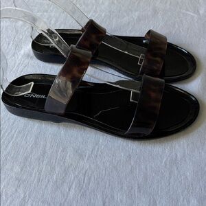 Pre owned. Stylish O’NEILL sandals with black soles. Perfect for everyday wear. Perfect for a pool day as these are all plastic and can get wet without compromising class. See pictures for details and condition.