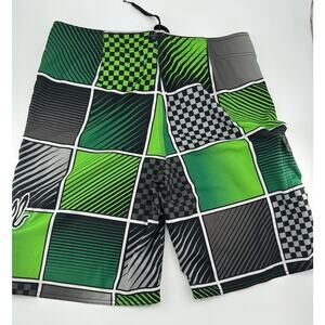 Drawstring and Velcro waist, Velcro pocket, green checker board print, excellent condition.