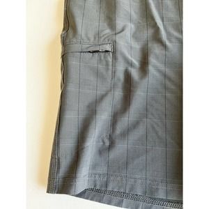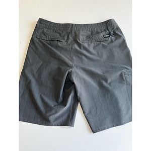 O’Neill Crossover Hybrid Shorts. These shorts can get wet. 90% Polyester 10% Elastane. Machine wash cold, gentle cycle. Plaid pattern, length: 21 Inches, and has 4 usable pockets. Zipper, and button closure.