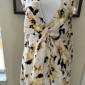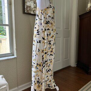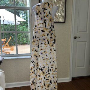 Pretty maxi dress featuring button back with V-neckline and openwork mid-drift and side slits. Measurement: length, 55"; armpit to armpit, 18"; waist, 19"; hips, 23".