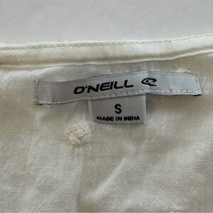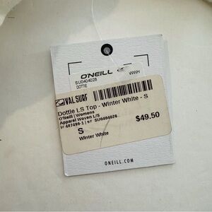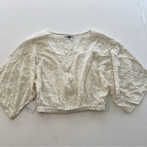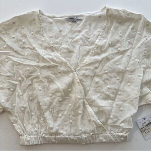 O’Neill Dottie top in Winter White. Cropped, v-neckline, oversized fit, dolman sleeves, elastic hem, hook & eye closure in front. 100% cotton. NWT, wrinkled from storage but I will stream before sending. Size small, approximate measurements laying flat 17.5” shoulder to hem, 18” pit to pit. Stock photos to show fit.