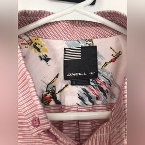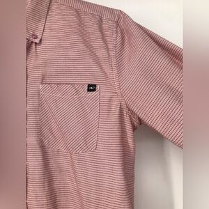 O’Neill Harper Stripes & Dashes Long Sleeve Button Up. Color is “spice”. One front pocket. Inside cuff matches back neck area pattern. Size Small. Sleeve inseam 19.5, Layflat chest 21”, see pic for length.