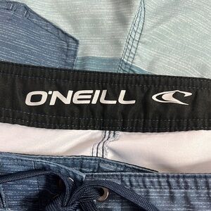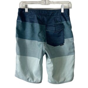 O'Neill Hybrid Shorts Men's 28 Blue Ombre Lace Up Front Back Pocket Inseam 9.25", boardshorts, casual hook & loop back pocket, very good condition, woven fabric , 100 poly