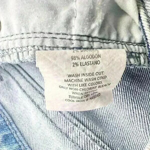 Good condition. No rips, or stains. 5 pocket, zip fly. Distressed, raw hem junior sizing denim shirts.
