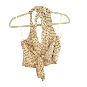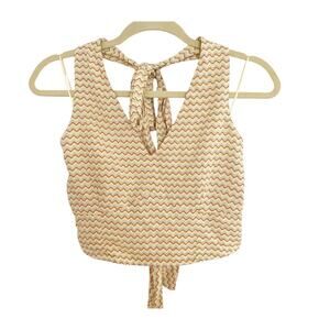 Pale yellow retro squiggly line print v neck crop halter top. Adjustable tie back & neck. Double lined. 100% viscose. Size Large. NWOT.