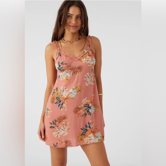 Frilly ruffled edges along the neckline and straps enhance the charm of this leggy dress fashioned in a trendy babydoll silhouette.