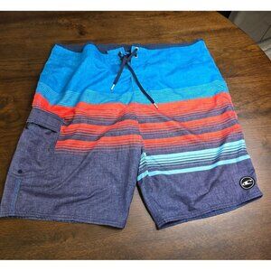 ONeill Mens Size 40 Board Shorts Blue/Red Striped Swim Trunks Polyester Adjustab